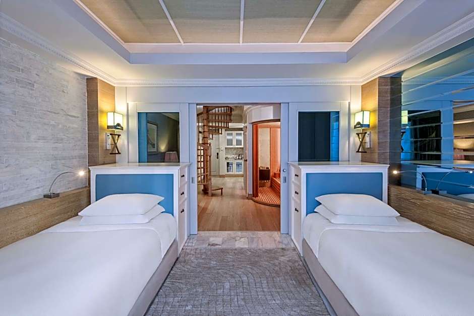 This 315 ft² duplex suite features two separate bedrooms; one bedroom with a special Serenity Super King Size bed and a second bedroom with 2 Small Double Size beds. Both floors consist of a sofa and armchair, bathrooms with shower and toilets, 40 inch LCD television, iron and ironing board. A MP3 player/radio/alarm clock, pillow menu, tea and coffee making facilities as well as free WiFi are provided. This suite also offers a sauna, kitchenette, sitting area and sunbeds on a private terrace.