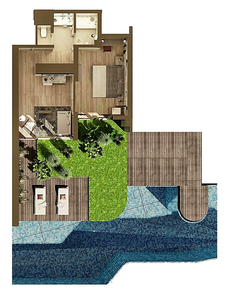 This 220 ft² family room features a Special Serenity Super King Size bed in one bedroom and 2 Small Double Size beds in the second one. All rooms have a sofa and armchair, bathroom with bathtub, shower and separate toilet, 40 inch LCD TV, iron and ironing board.A MP3 player/radio/alarm clock, pillow menu, tea and coffee making facilities as well as free WiFi are provided. This room has a direct pool access from the balcony via stairs.